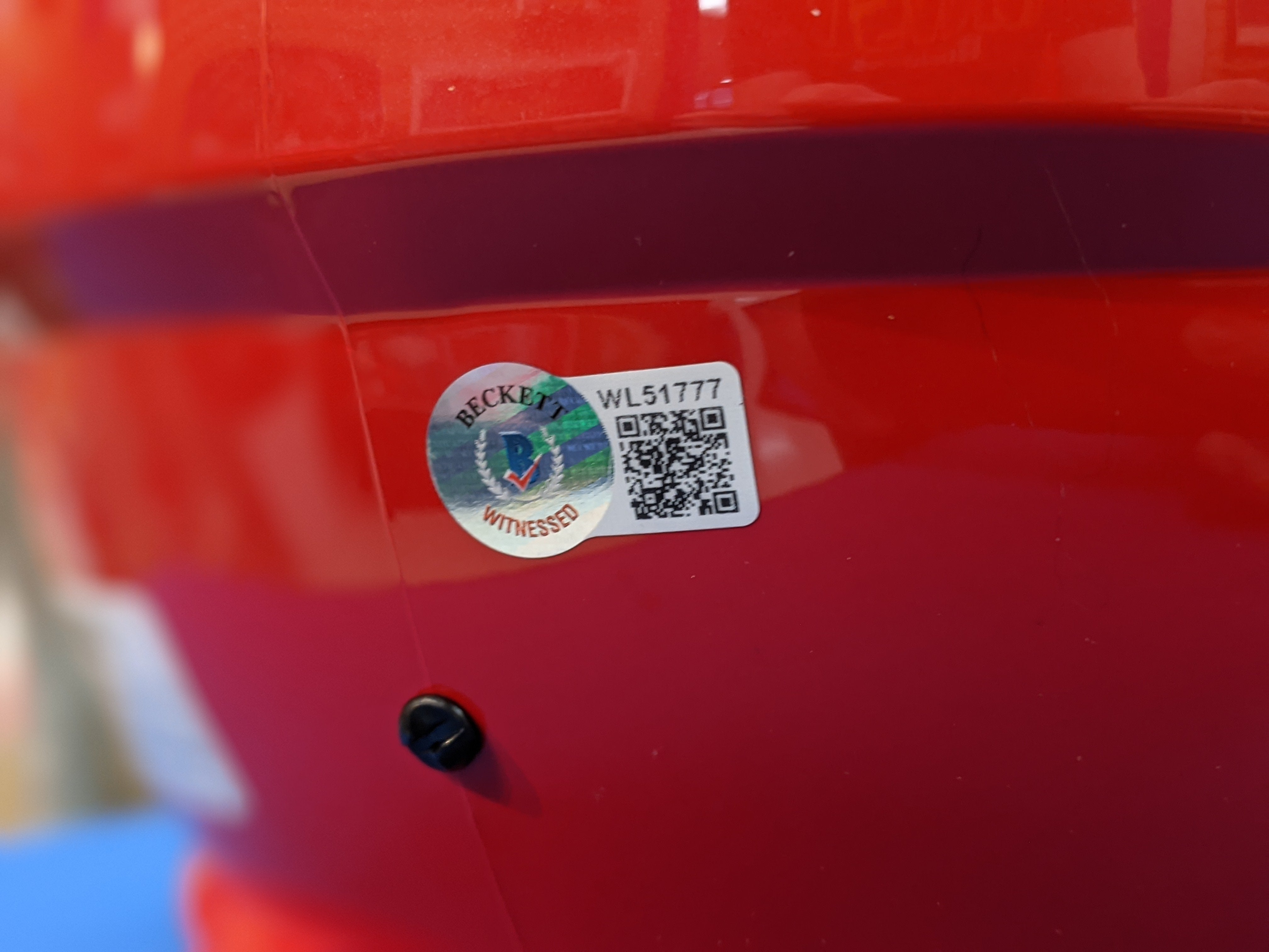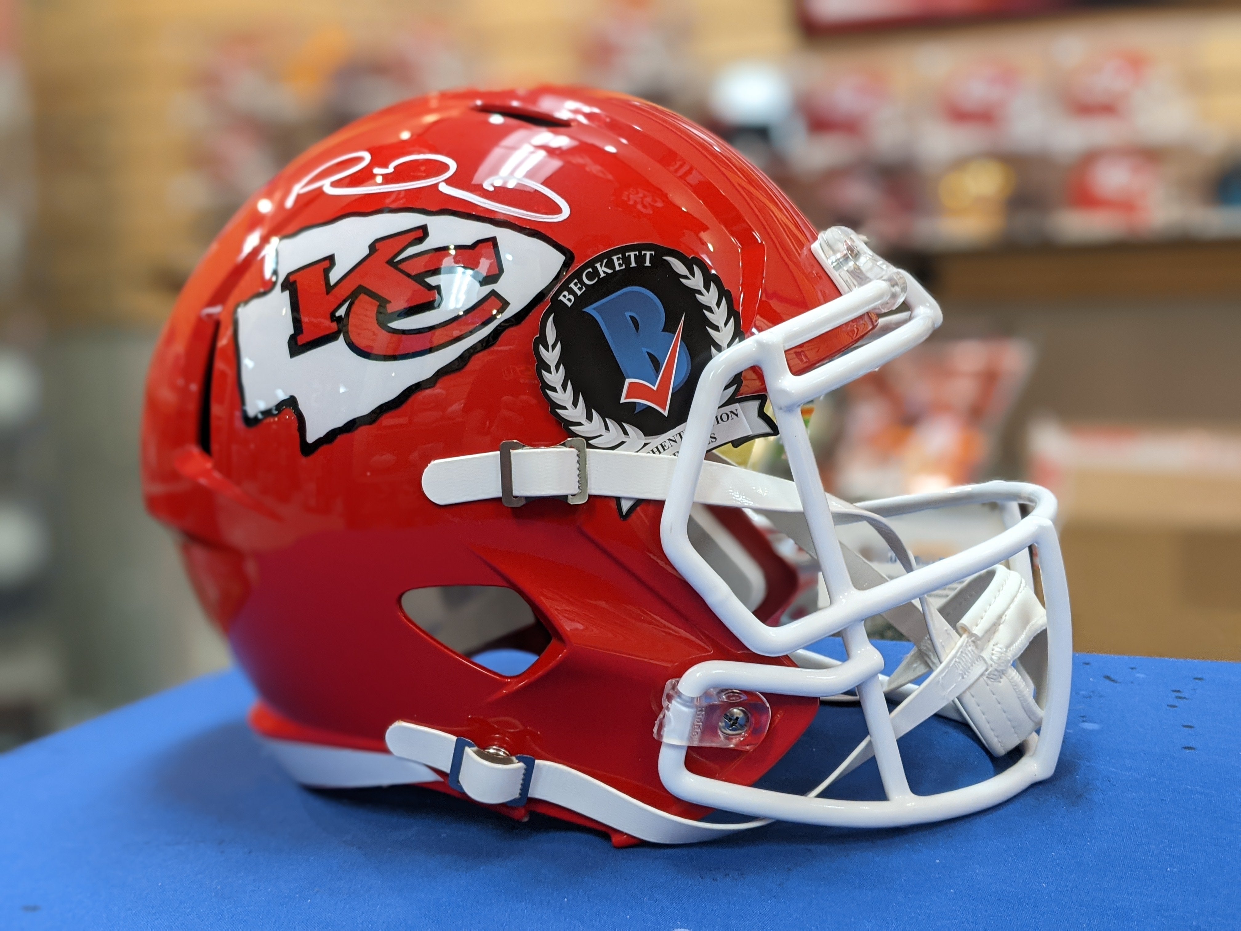 These full size speed REPLICA helmets are made by Riddell and were signed beautifully in white paint. Awesome and unique piece of Chiefs memorabilia. This is a replica helmet. Multiple helmets signed so autograph placement may vary slightly. Witness authenticated by the best in the business, Beckett.