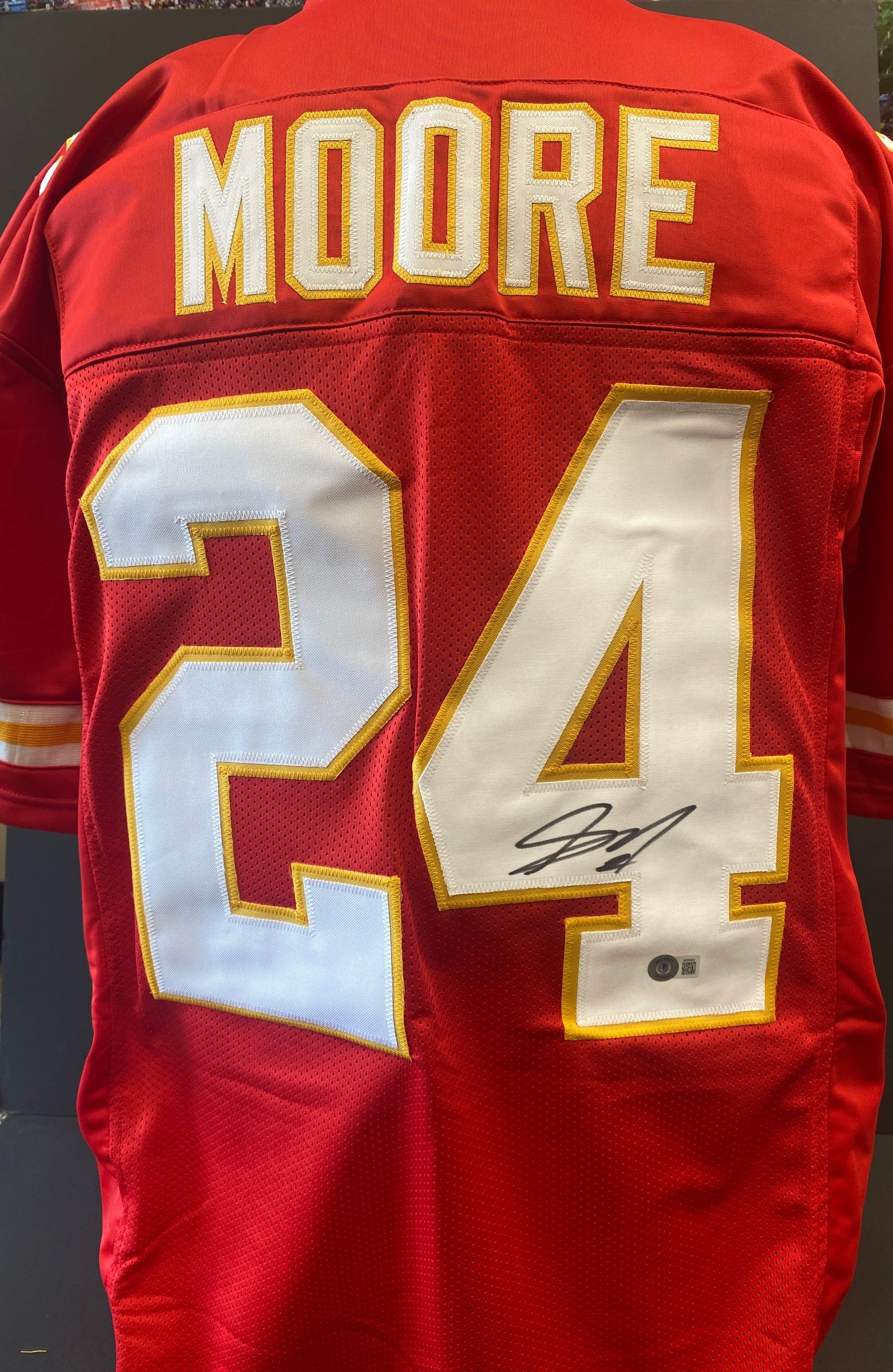 Skyy Moore did a public signing at our store February 22, 2023. These red custom jersey are signed in black paint pen.
