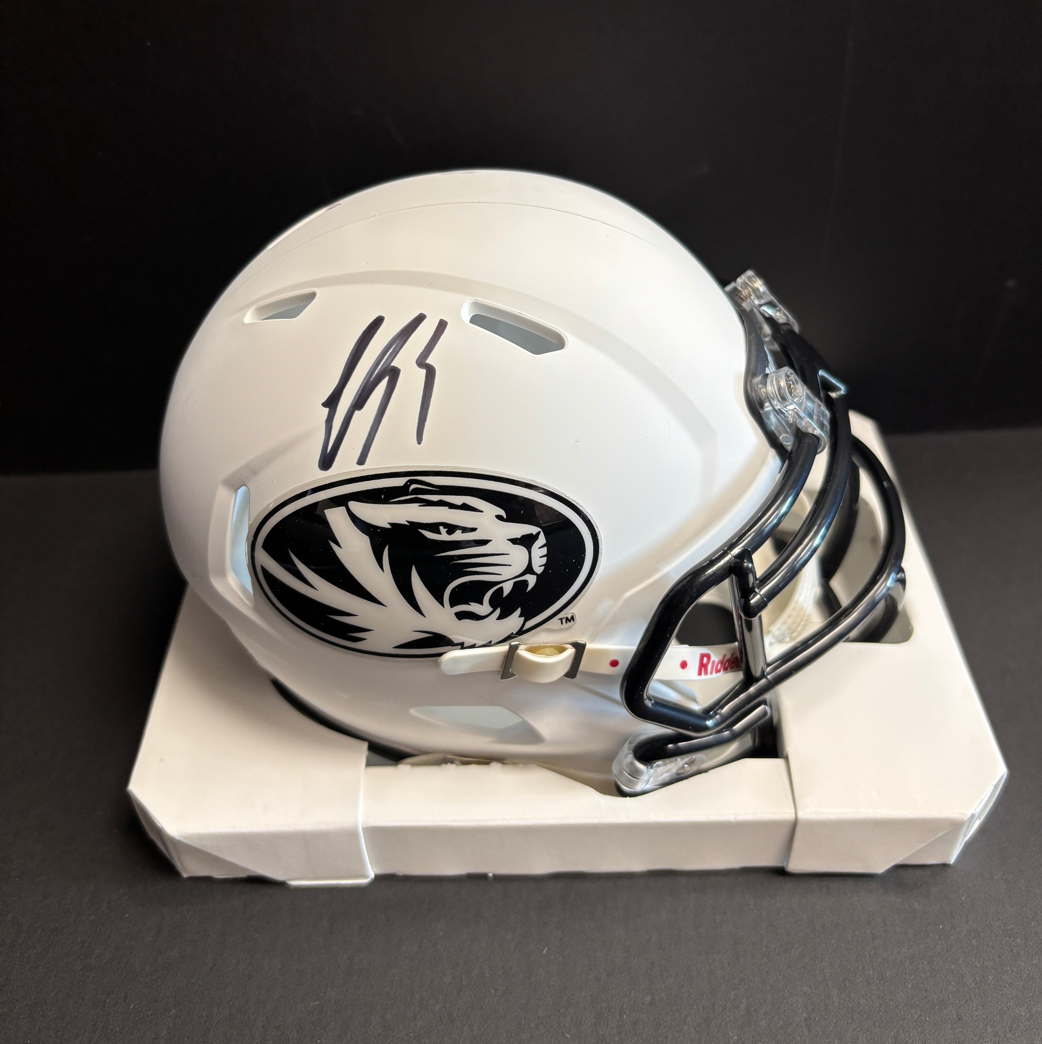 Luther Burden signed Missouri Tigers mini-helmet. Burden attended East St. Louis Senior High School. He was a star in both basketball and football. Luther Burden III did a public signing on February 3, 2024. These WHITE MINI HELMETS are beautifully signed in black ink. These WHITE MINI HELMETS are BECKETT Witness authenticated. Multiple WHITE MINI HELMETS were signed, and autograph placement and BECKETT number sequence may vary slightly.